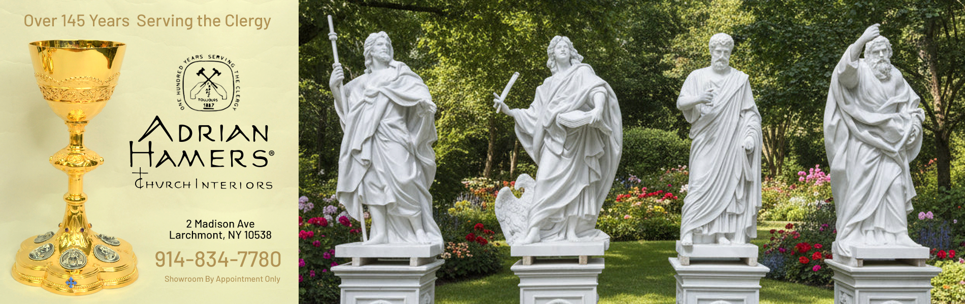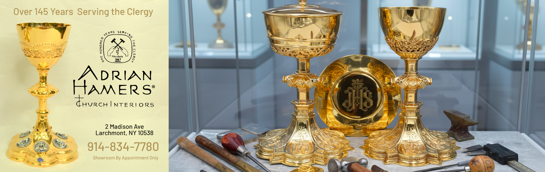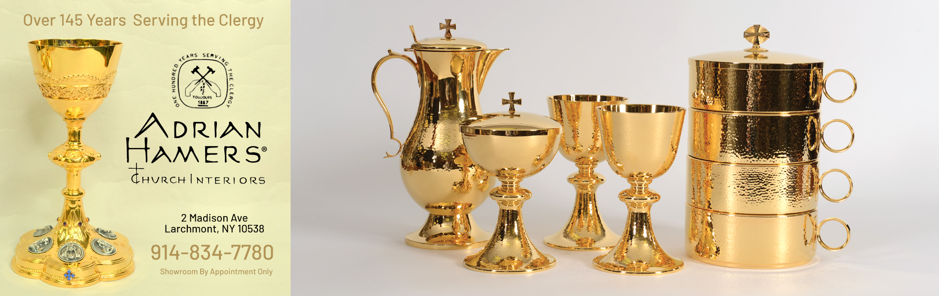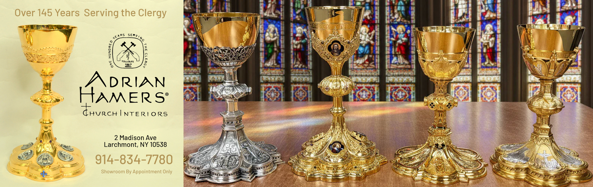 Adrian Hamers Church Interiors, Well known for Museum Quality Gold & Silver Chalices. Antique Church Stained Glass windows available. We buy and sell antique church stained glass windows. We buy Tiffany Windows and we sell Tiffany Studios Stained Glass windows. Manufacturers of Church Metal Ware and Church Furnishings. We are your complete church supply and service company. We invite you to visit our showroom to see our exclusive exhibit of religious sacred vessels. We are a leading Church supply company serving the clergy for over 140 years. Our Solid Sterling Silver Chalice models include: Authentic Byzantine Chalice, Carolingian, Romanesque Chalice, Traditional Gothic Chalice, Baroque Chalice and Edwardian Style Chalices. These, along with our Contemporary Chalice models, make up a unique display of thousands of Sacred Vessels. In our work we can incorporate a wide range of finishes such as gold-plate Chalices, silver-plate Chalices, copper, bronze, oxidized or antique Chalices. We do filigree, hand embossing, hand hammering and specialize in enamel work and hand chasing on all religious vessels. We also work with precious and semiprecious stones. We also Sell Authentic Antique Sterling Silver Chalices with thousands on display. We have Tiffany studios stained glass windows on display for sale.