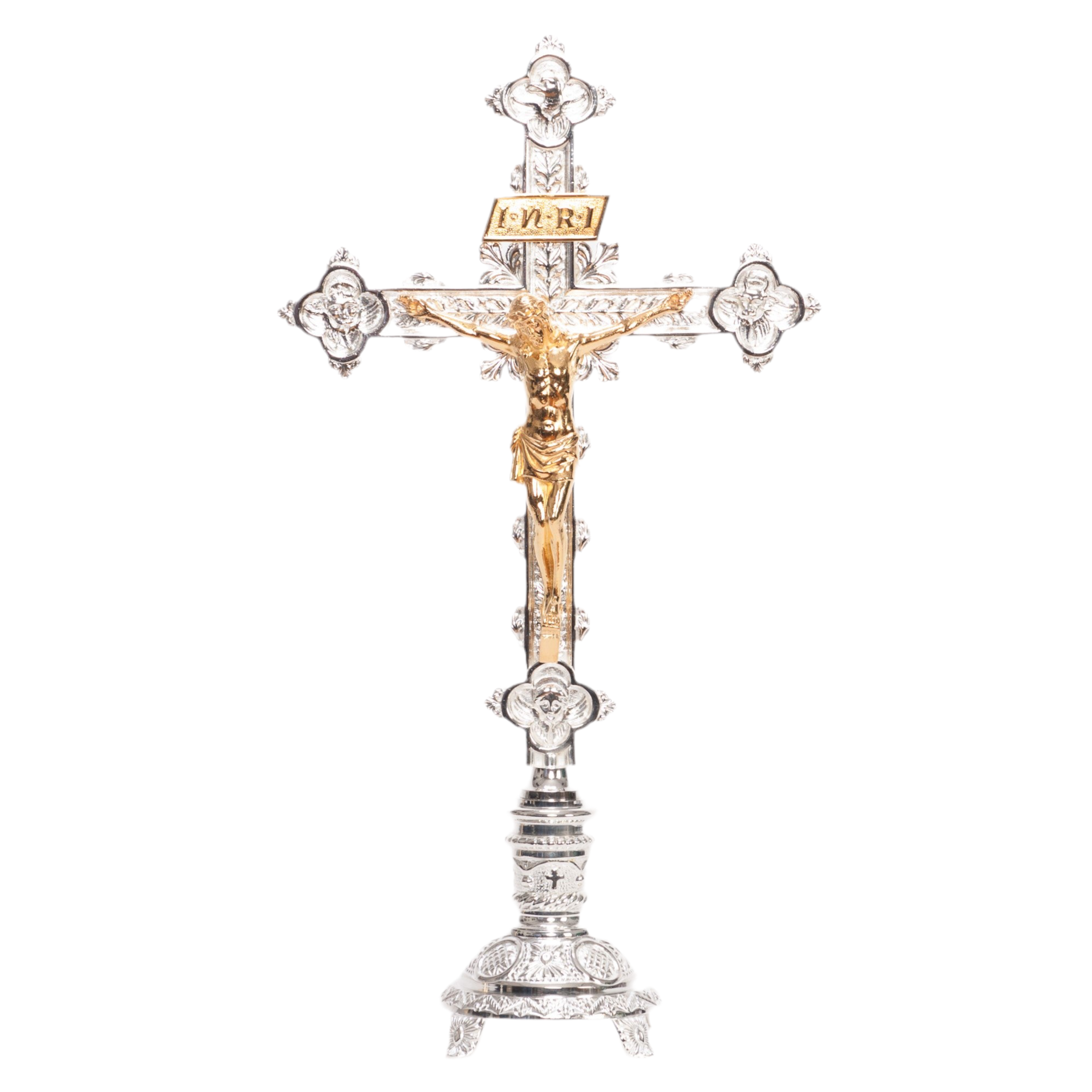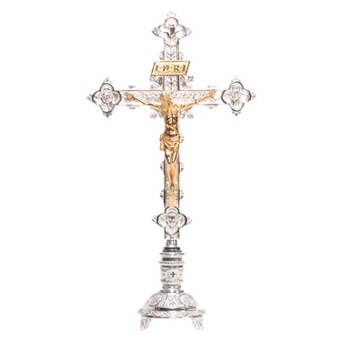 Short 24" Silver Plated Altar Cross with Gold Plated Corpus and INRI.