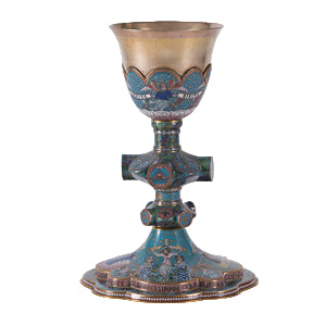 Item Information: H7337This Byzantine chalice has an eternal style. Elaborate Enamel  outside with a 24kt. gold finish in cup. Full matching paten.