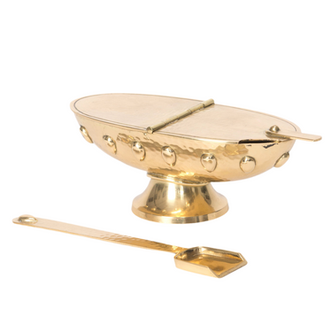 Our World Famous Cathedral Incense Boat and Spoon for our World Famous (H-173) Censer of the same design. Brass and Lacquered.