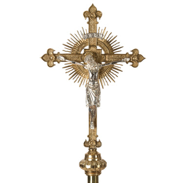 Traditional Processional Cross in solid brass with silver plated corpus and "INRI".