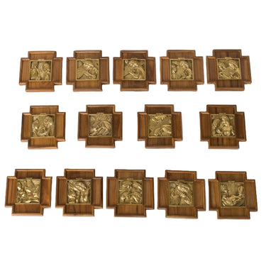 Complete set of 14 Stations of the Cross: Solid Brass Station Panels Mounted on Hand Carved Wood Backplates- Mounting Hook Attached to back for easy hanging.