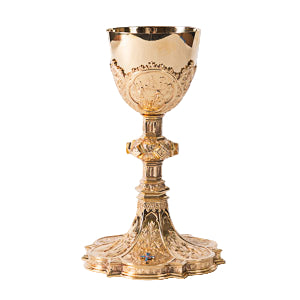 A classic gothic style chalice with a sterling silver cup. The chalice is finished with a 24t. gold plate.