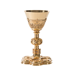 This is a cup sterling chalice executed in french gothic style and finished in 24t. gold plate.