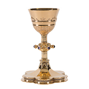 This is the finest example of gothic perfection. A raised open filigree base to carry the great gothic style of this all sterling silver chalice. The finish on this chalice is pure 24kt. gold-plate. The node is adorned with six amethyst cabochon stones. The amazing workmanship is second to none.