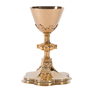 This chalice is the perfect example of super fine craftsmanship and simplicity in Gothic design. Open raised hexafoil base is unbelievable and adorns a raised Crucifixion panel.
